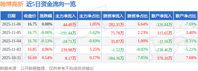 11月6日的资金流向数据方面,主力资金净流入44.49万元,占总成交额1.05%,游资资金净流入282.35万元,占总成交额6.64%,散户资金净流出326.84万元,占总成交额7.69%。